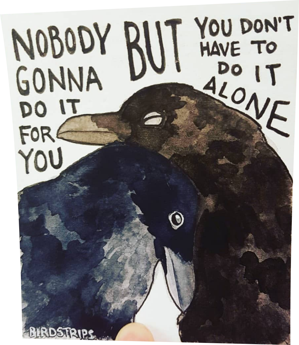 ![Cartoon with two boreal chickadees. First panel birds are eating seeds on the ground. One says 'What if it's rotten inside?' the other says 'It's not'. Second panel the birds are flying, one says 'What if we don't make it in time?' the other says 'We will.'. Third panel the birds are hanging off pinecones in a tree, one says 'What if I can't do it?', the other says 'You can'. Fourth panel the birds are facing the viewer, one says 'What if... everything's gonna be okay?', the other says 'It is'.]()