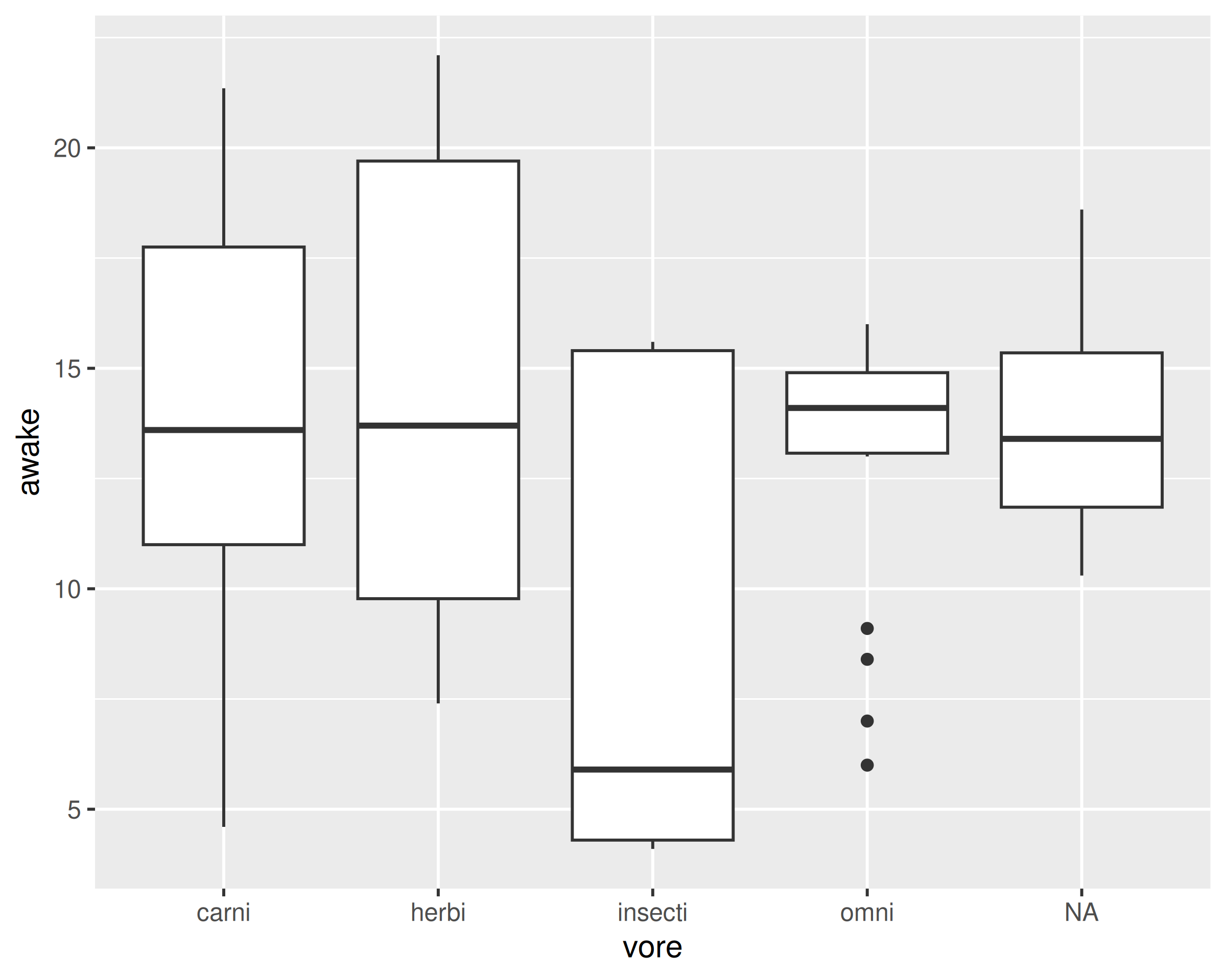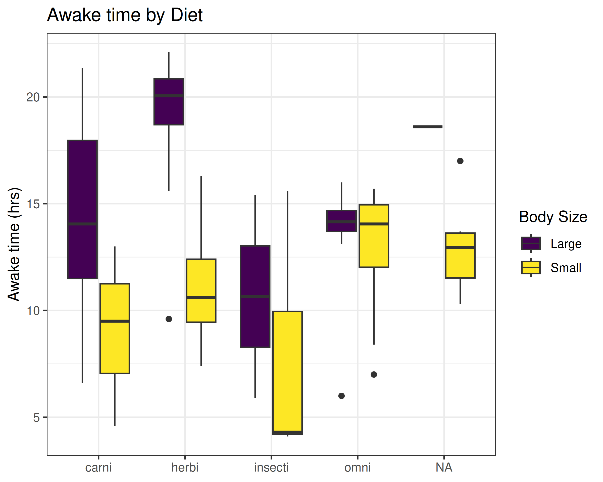 library())vore?ggplot(data = m, aes(x = vore, y = awake, fill = `Body Size`)) +