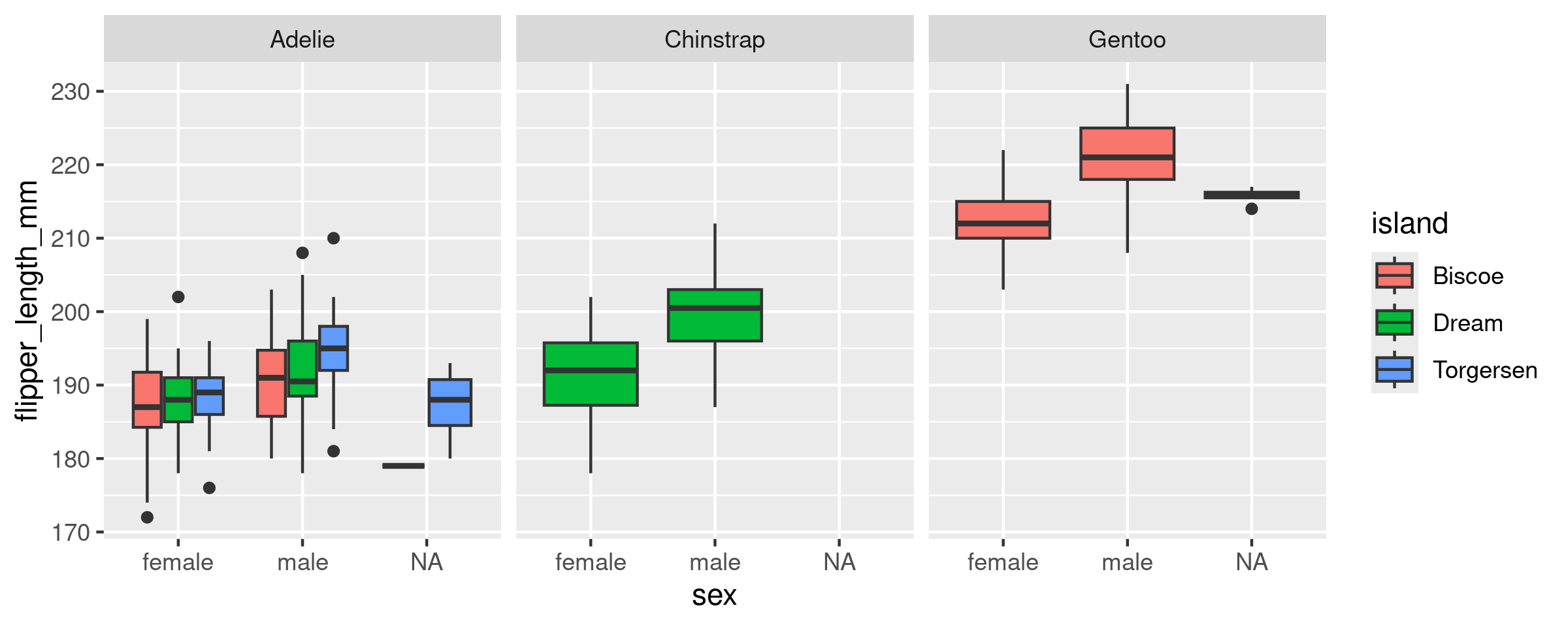 Too Easy? Split boxplots by sex and island
