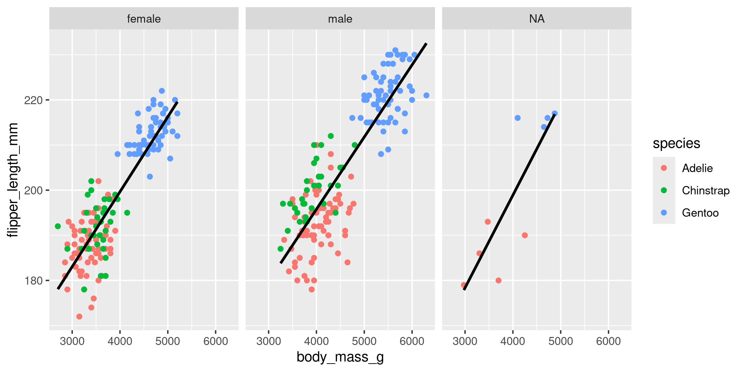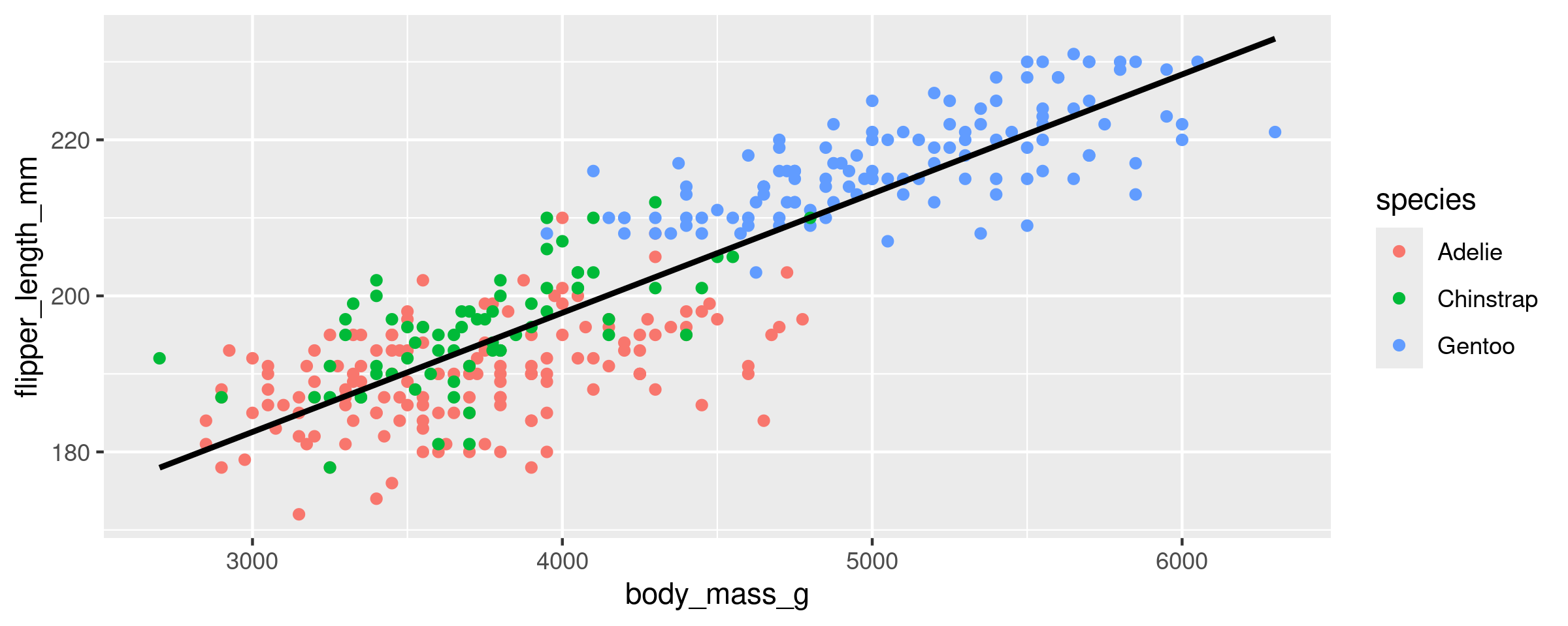 g3 <- ggplot(data = penguins, aes(x = flipper_length_mm, y = body_mass_g, colour = species)) +